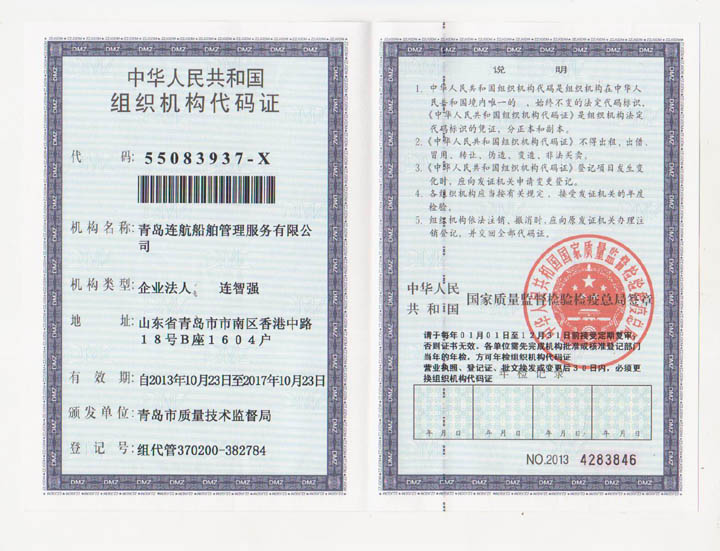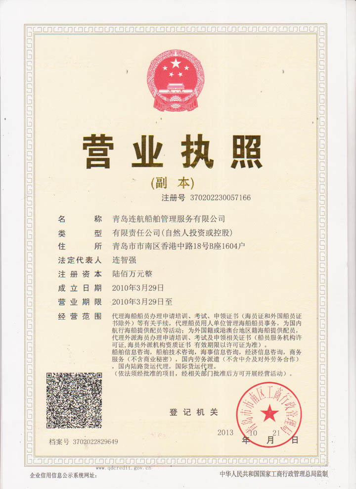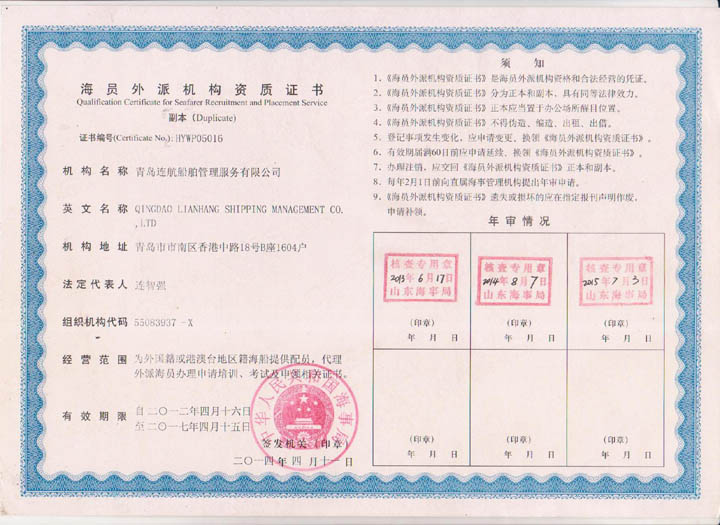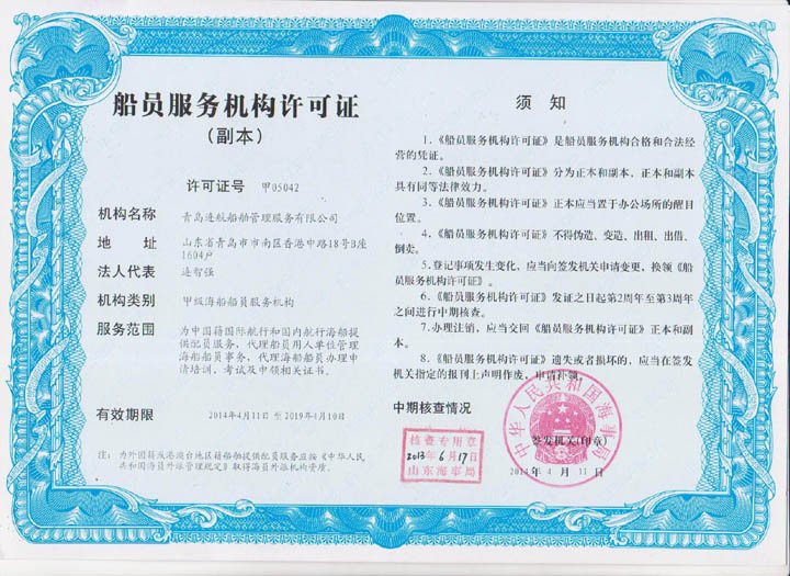 2012年04月青島連航船舶管理服務(wù)有限公司取得《海員外派機(jī)構(gòu)資質(zhì)證書》,為海洋船舶提供配員,代理船員用人單位管理海洋船舶船員事物,代理海洋船舶船員申請培訓(xùn)、考試、申請證書等業(yè)務(wù)。